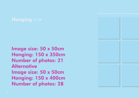 350cm Hanging –-> Image size: 50 x 50cm Hanging: 150 x 350cm 150cm Number of photos: 21 Alternative Image size: 50 x 50cm Hanging: 150 x 400cm Number of photos: 28 8 9