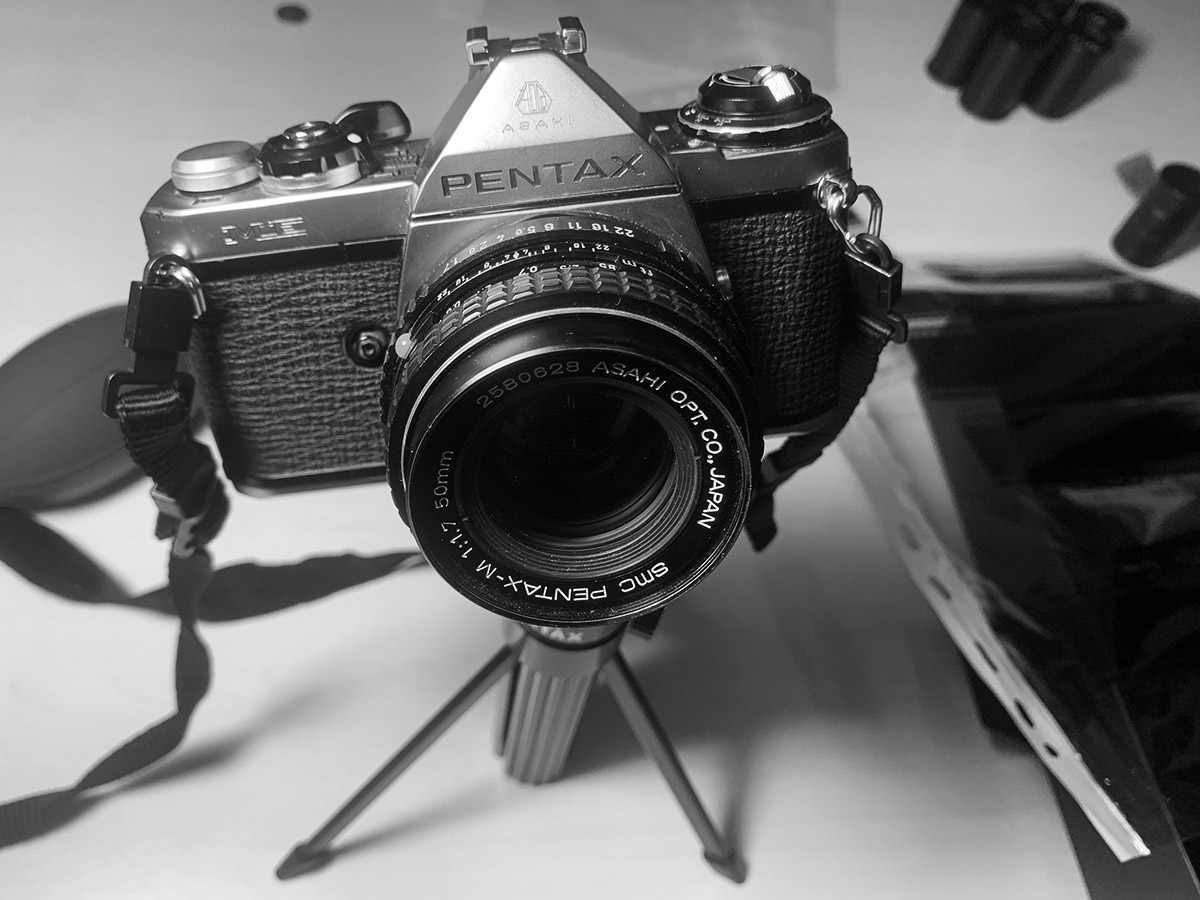 Diese kleine Pentax Me konnte ich heute für 50 EUR bei einem netten Menschen in meiner Stadt abholen. Die Kamera besitzt eine Zeitautomatik. Der Fotograf setzte die Blende, die Kamera wählte die Verschlusszeit entsprechend. Eine +/− 2 EV Belichtungskorrektur ist vorhanden (Wikipedia). Das beste, die Kamera ist superleicht und sehr leise. Ich habe sie gleich getestet. Scheint alles zu funktionieren :-) Danke lieber Verkäufer!
